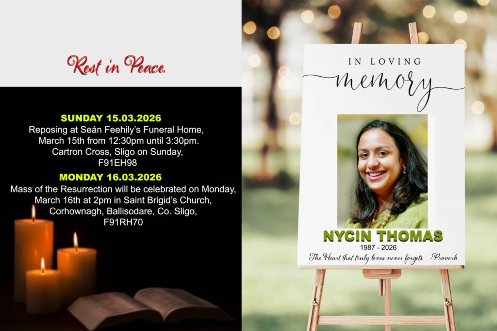 Sligo: Nycin Thomas (38), a dialysis nurse at Sligo University Hospital, passed away recently in Sligo. Her funeral will take place on Monday, March 16, at 2:00 PM at Saint Brigid’s Church, Corhownagh, Ballisodare, Co. Sligo (F91RH70).