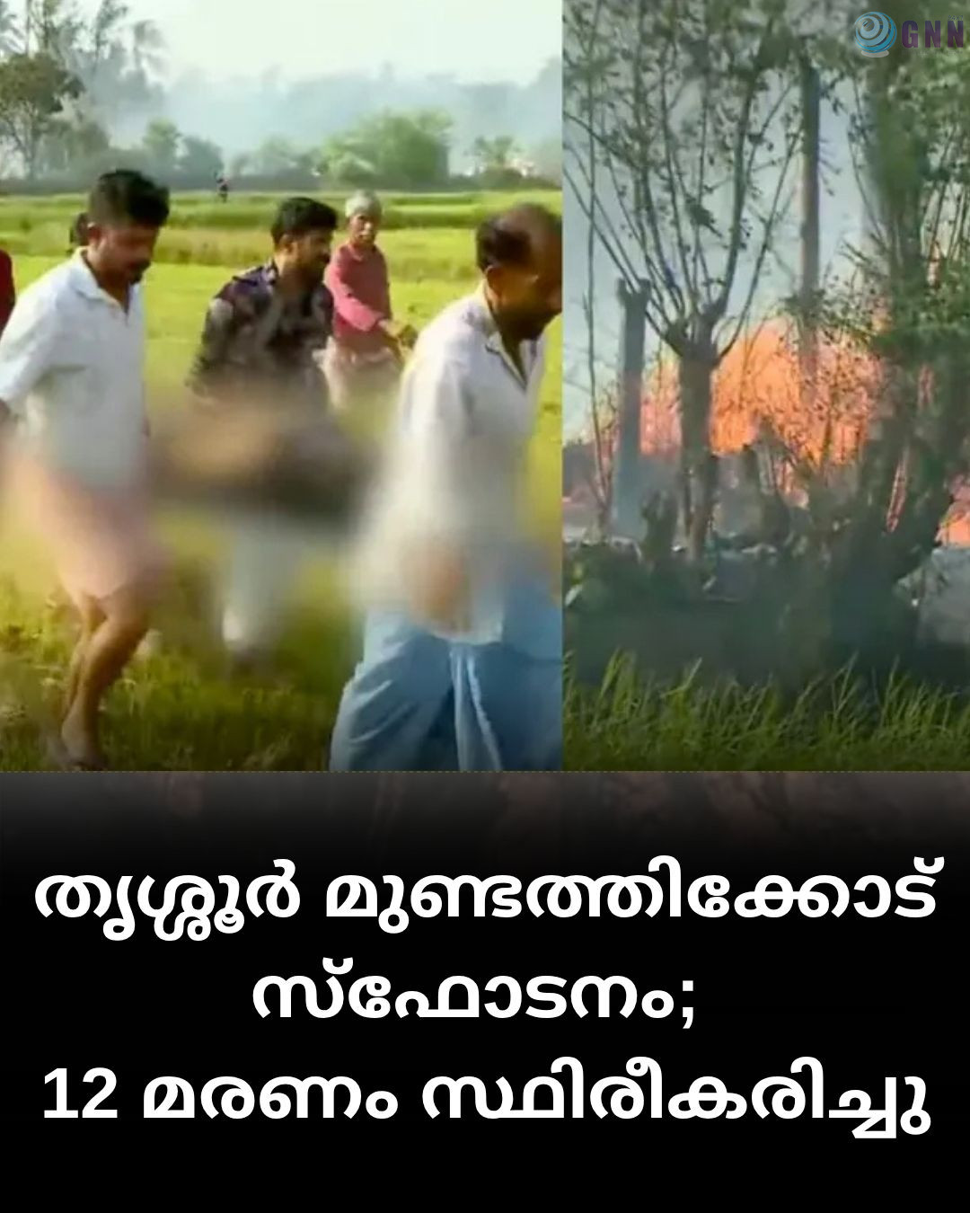 തൃശ്ശൂരിലെ പടക്ക നിർമാണ കേന്ദ്രത്തിലുണ്ടായ ഉഗ്ര സ്ഫോടനത്തിൽ മരണ സംഖ്യ ഉയരുന്നു. പന്ത്രണ്ട് പേരുടെ മരണം നിലവിൽ സ്ഥിരീകരിച്ചു. പത്ത് പേരുടെ നില ഗുരുതരമാണ്. വൈകിട്ട് മൂന്നരയോടെയാണ് അപകടം ഉണ്ടായത്. മുണ്ടത്തിക്കോടുള്ള വെടിക്കെട്ട് പുരയിലാണ് സ്ഫോടനം ഉണ്ടായത്. നിരവധി തൊഴിലാളികൾക്ക് പൊള്ളലേറ്റതായാണ് ലഭ്യമാകുന്ന വിവരം തൃശൂർ പൂരത്തിനുള്ള തിരുവമ്പാടി വിഭാഗത്തിന്റെ സാമ്പിൾ പുരയിലാണ് അപകടം ഉണ്ടായത്. പടക്കശാലയിൽ മുപ്പത്തോളം പേർ ഉണ്ടായിരുന്നതായും എല്ലാവരും മലയാളികളാണെന്നുമാണ് വിവരം.