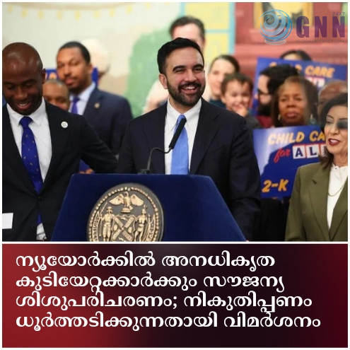 ന്യൂയോർക്ക് ഗവർണർ കാത്തി ഹോക്കലും മേയർ സോഹ്റാൻ മംദാനിയും ചേർന്ന് നഗരത്തിലെ രണ്ട് വയസ്സുള്ള കുട്ടികൾക്കായി സൗജന്യ ശിശുപരിചരണ പദ്ധതി പ്രഖ്യാപിച്ചു. വരുമാനമോ, താമസിക്കുന്ന സ്ഥലമോ, ഇമിഗ്രേഷൻ പദവിയോ നോക്കാതെ എല്ലാവർക്കും ഈ സേവനം ലഭ്യമാക്കുമെന്നാണ് പ്രഖ്യാപനം.